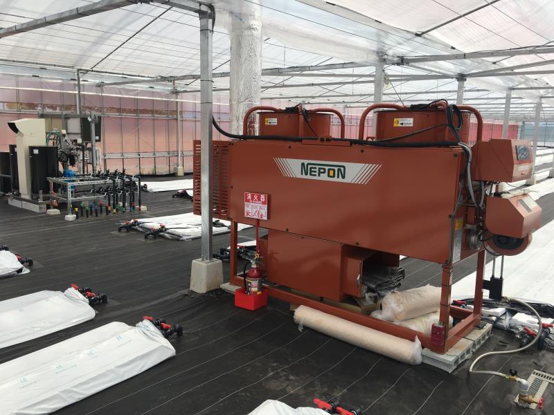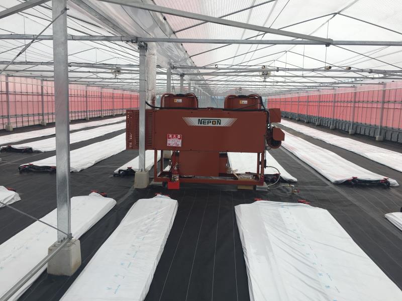 今回、ネポン製の環境制御「アグリネット」を設置しており、温度・湿度・二酸化炭素などをセンサーで監視し、カオンキ・炭酸ガス発生機などと連動しております。