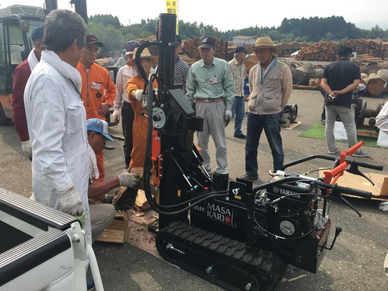 大分県日田市にある日田中央木材市場様にて、業務用薪割機の実演を行わさせて頂きました。
