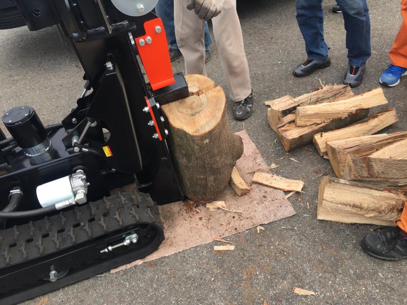 国産にこだわった新型自走式薪割り機40t 薪割り機「MASAKARI」の実演を行いました。破砕力は40トン。可変式で、軽い力で姿勢変化が行えるようにガススプリングを搭載。デッドマンクラッチを装備し安全面にも配慮しています。