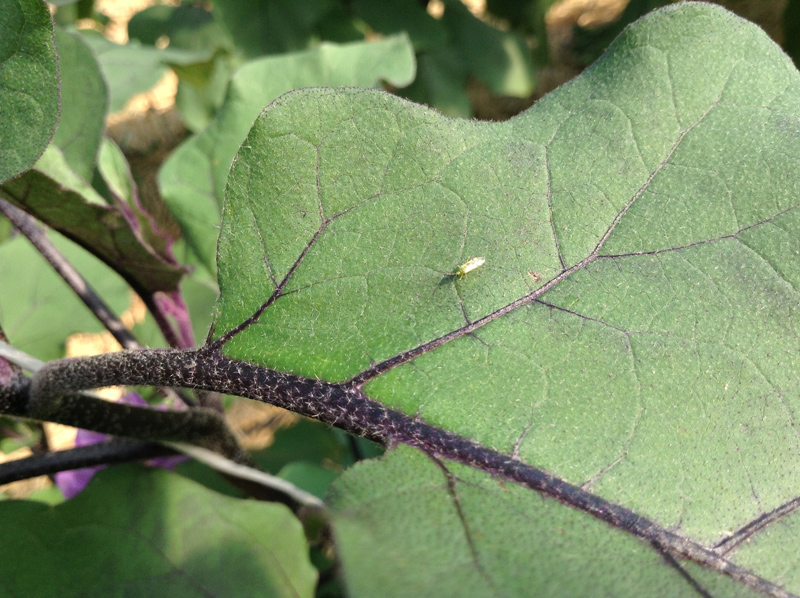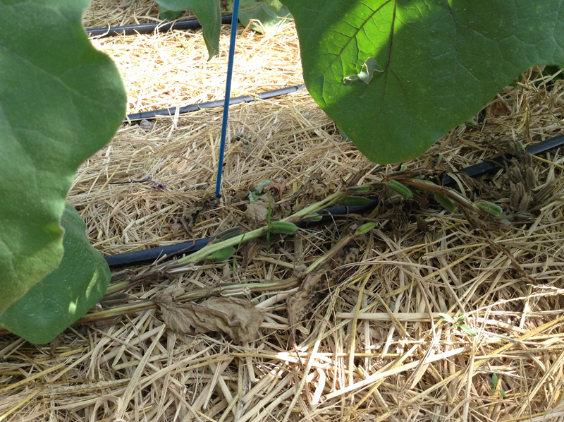 ナス農家様見学 天敵の付着したゴマを圃場においている様子